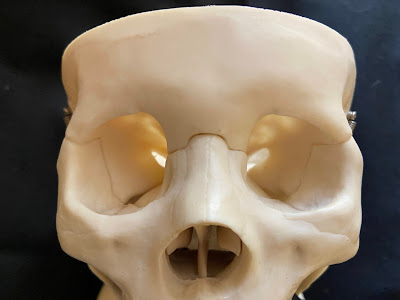 1. Frontale o coronale, osso impari, a forma di conchiglia, diviso in due fino al secondo anno di vita, di cui resta traccia talvolta nella sutura metopica. Sulla faccia anteriore di notano due tuberosità, bozze frontali al centro delle quali, in corrispondenza del naso c'è una rilevatezza, la glabella, poi due arcate sopraccigliari e, inferiormente, le due arcate orbitali che formano contorni superiori delle orbite.